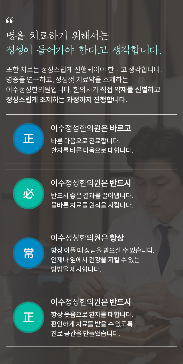 환자의 아픔을 공감하는 이수정성한의원 좋은 결과를 위하여 항상 노력하는 이수정성한의원의 의료진입니다.