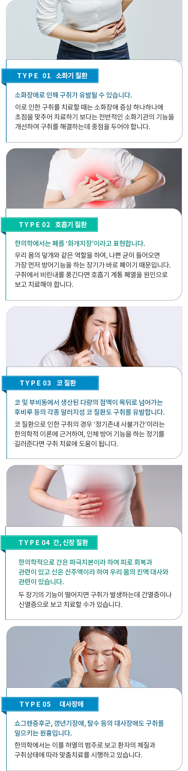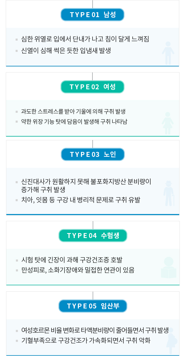 위장질환 > 담적 위장질환 > 역류성 식도염 위장질환 > 만성 소화불량 위장질환 > 만성 변비 위장질환 > 잦은 설사 위장질환 > 구취
